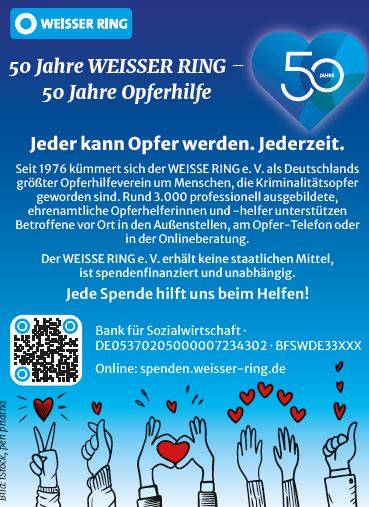 Viele spenden Geld oder Zeit. Aber was können Sie tun, wenn Sie das nicht können oder wollen? Spenden Sie Anzeigenraum. Platzieren Sie eine aussagekräftige Anzeige des WEISSEN RINGS in Ihren Medien, auf Ihrem Blog oder als Print-Anzeige im Gemeindebrief, im Rundbrief Ihres Sportvereins oder im Status Ihres Messengers. So machen Sie auf die Arbeit der Opferhilfeorganisation aufmerksam und unterstützen Opfer von Kriminalität und Gewalt.